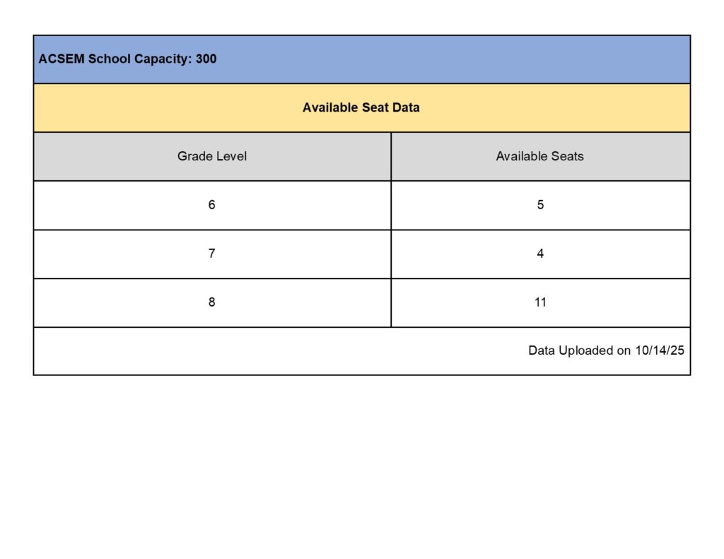 Below is our student capacity/seat availability, by grade level. We are required to update this information every 12 weeks, please note that the capacity number may change during the 12-week period as family members may withdraw or new families apply.